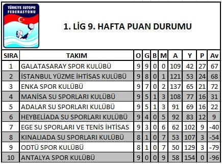 Sutopu 1. Lig 9. Hafta sonunda puanlama aşağıdaki gibi oluştu: