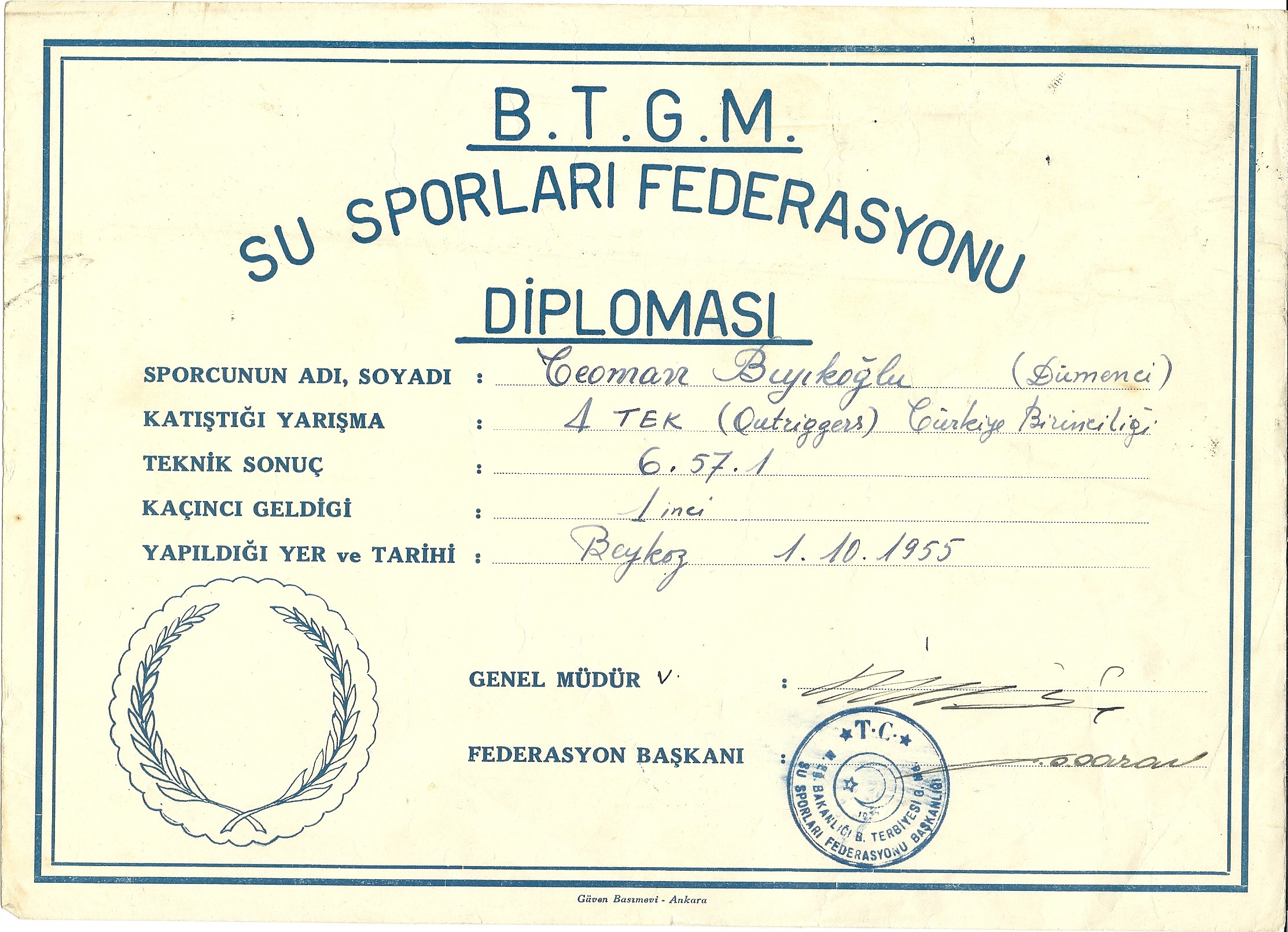 1955 yılında Barcelona’da yapılan Akdeniz Oyunları Kürek Yarışlarına katıldık. Gemi ile yedi gün süren bir yolculuk yapıldı. Dört Tek teknesi İstanbul’dan gemiye yüklenerek Barcelona’ya taşındı ancak Tek Çifte ve İki Çifte tekneleri oradan kiralandı. Dört Tek ekibinin yarıştan bir gün önce yaptığı antrenmanda Orhan Akı’nın küreği kırıldı. Yerine tedarik edilen kürek tam oturmadı, final yarışında 1600 metreye kadar çok iyi gelen ekip o anda Orhan’ın küreğini kaptırması ile avantajını kaybetti ve Mısır’ı geçerek 5. oldu.