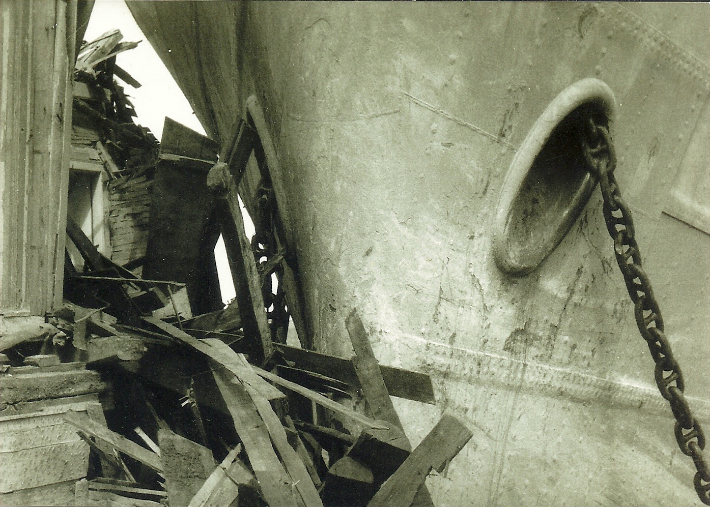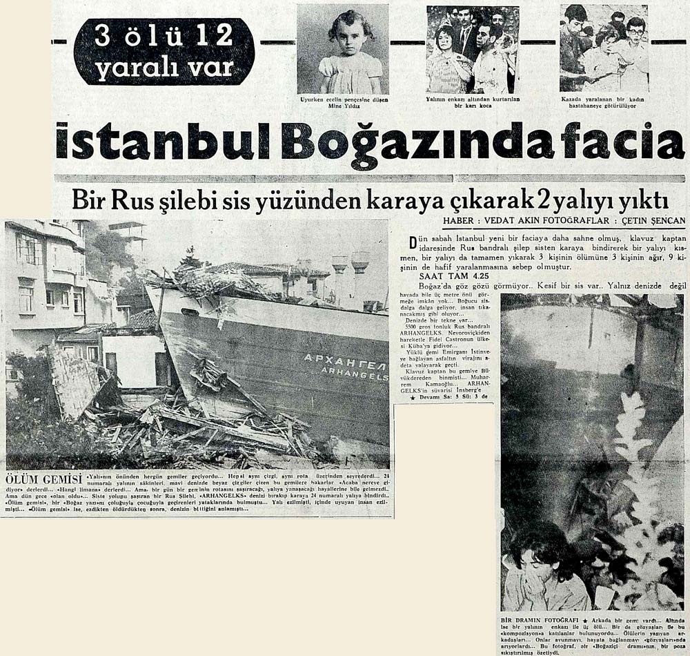 Resimler: Rumelihisarındaki evlerine çarpan Rus Gemisi ve yıkıntıların arasında ağabeyi Hasip Öge, arkasında evin ortasına kadar girmiş olan gemi.