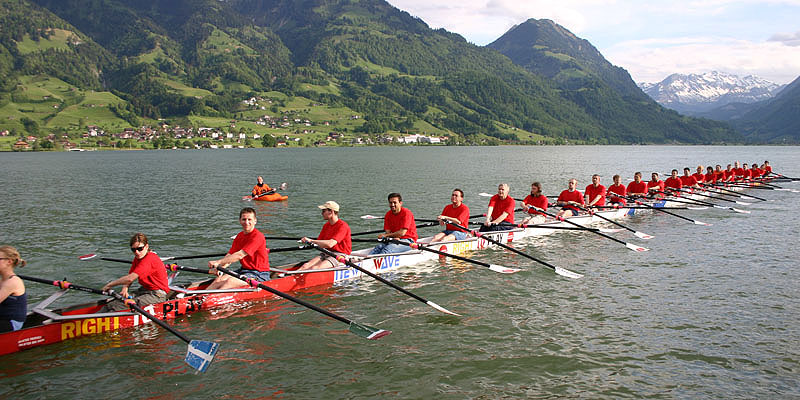 Resim: Melchior Bürgi‘nin altı tane Dört Çifte teknesinin montajı ile yarattığı 24 Çifte Teknesi (Foto: ETH-Instituts für Geotechnik-Prof. Sarah M. Springman) Akademik araştırmayı İsviçre’nin eski milli kürekçileri Sarah Springman (kürek sporu dışında 20 Triatlon Madalyası, 5 Ironman yarışı katılımı) ve Aurelian Schumacher yaptılar, Sarnersee’de yapılan resimdeki deneme çalışmasında biri teknenin dümenine biri de bir numaraya oturdu.