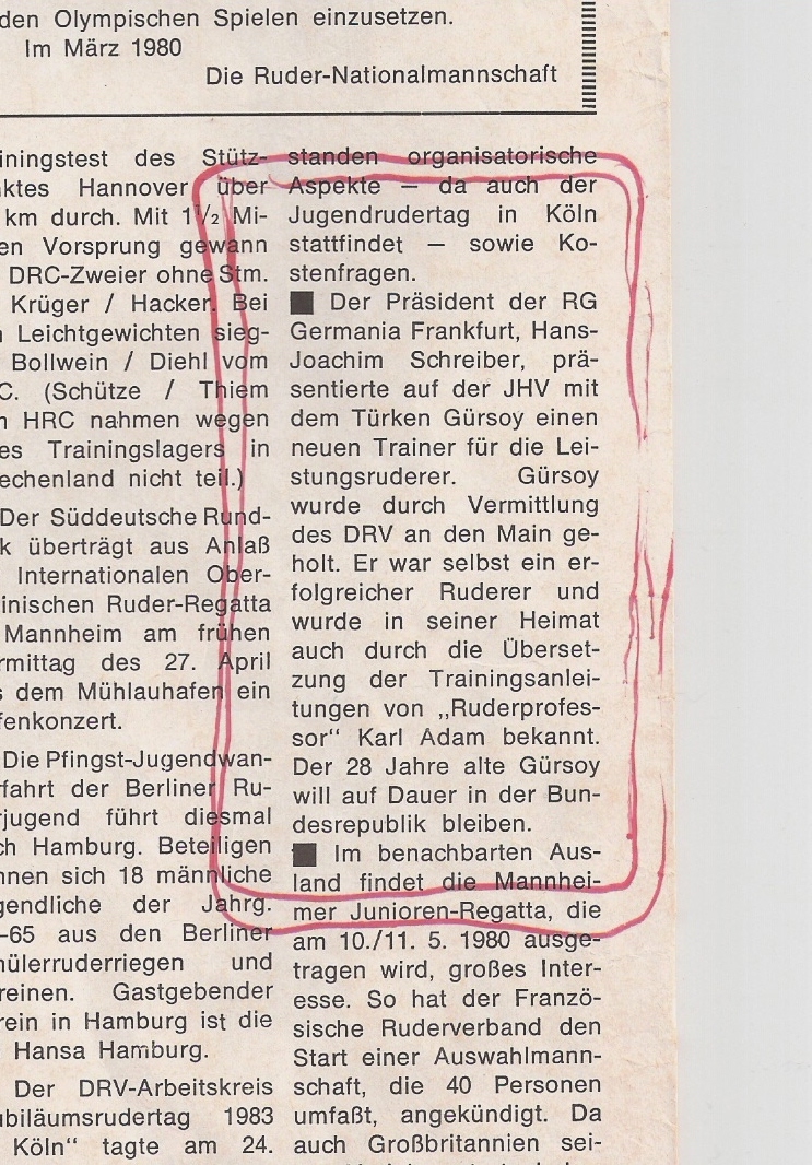 (Tercümesi: RG Germania Frankfurt’un Başkanı Hans Joachim Schreiber, Yıllık Genel Kurulda yarış kadrosu için yeni antrenör Türk Gürsoy’u takdim etti. Gürsoy, Alman Kürek Federasyonu aracılığı ile Main’a getirildi. O, ülkesinde başarılı bir kürekçi idi ve aynı zamanda Kürek Profesörü Karl Adam’ın antrenman metotlarını tercümesi ile tanınmıştı. 28 yaşındaki Gürsoy, Almanya’ya yerleşmek istiyor.)