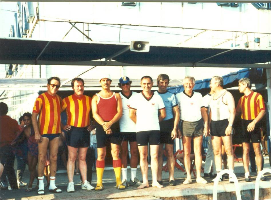 Resim: 1989 yılında 1960’lı yılların şampiyon kürekçisi Gültekin Türeli antrenörlüğünü yaptığı Borussia Frankfurt Kürek Takımı veteran sporcularını İstanbul’a getirdi. Galatasaray Adasında kayıkhanenin önünde soldan Emin Gezgöç, Ahmet Moralıoğlu, Ahmet Şenkal, mavi şapkalı bir misafir, Gültekin Türeli, Emir Turgan ve misafirlerimiz.