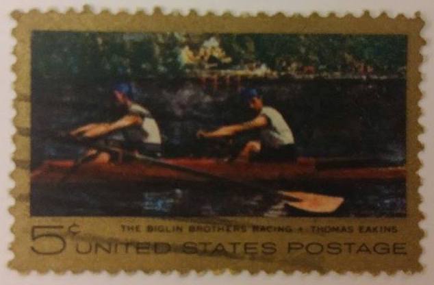 Ortadaki pul Biglin Brothers için Amerikada basılmış. Biglin Brothers, (John-James-Barney) 1800’lü yılların ikinci yarısında Amerika iç savaşının hemen ardından ve 1900’lerin başlarında Amerikada efsane olmuş kürekçilerdi. John ve Barney’in ressam Thomas Eakins tarafından yapılmış resimleri çok ünlüdür ve pul bu resimlerden birini göstermektedir.