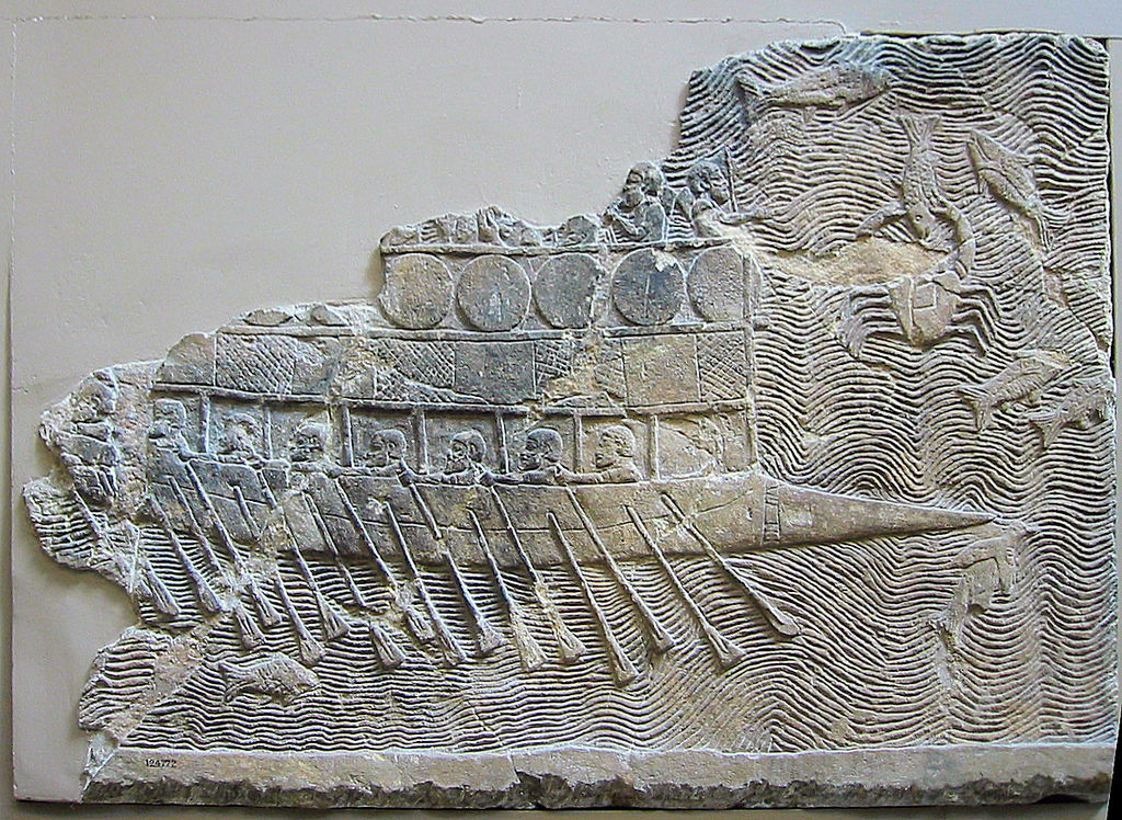 Yukarıdaki fotoğrafta Dicle Nehri kıyısında Asur Devletinin başşehri olan Ninova civarında 19. Yüz Yılda yapılan kazılarda bulunmuş olan MÖ 700 yıllarına ait olduğu belirlenen iki sıra kürekli bir Fenike savaş gemisi görülüyor.